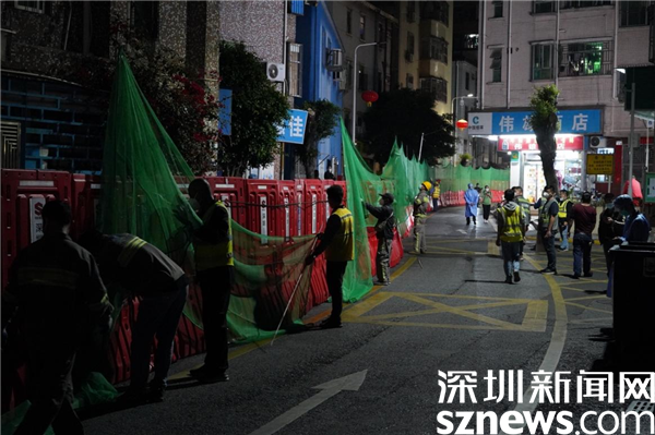 1日晚10點,在嚇圍新村村口,記者看見防疫工作人員正在拆除合圍的水馬,做解封前的最后準備。