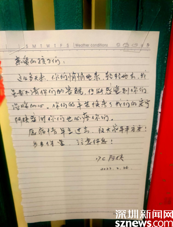 “親愛的孩子們,這么多天來,你們悄悄地來,輕輕地去,我雖看不清你們的容顏,但能感受到你們溫暖的心。你們的辛苦換來了我們的安寧,阿姨感謝你們也心疼你們?!边@是來自桂園街道華瑞大廈B座居民的手寫感謝信,一句“親愛的孩子們”戳中了現場工作人員的心,讓人忍不住淚目。
