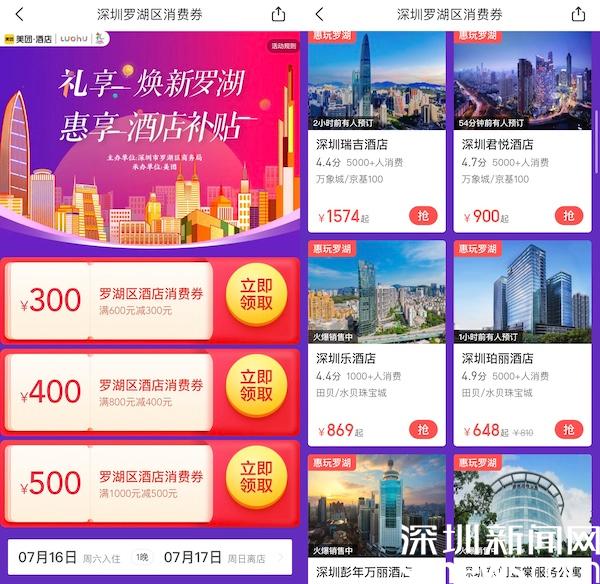 讀特客戶端·深圳新聞網2022年7月16日訊(記者 覃鈺清)7月16日,羅湖區會同羅湖區酒店行業協會、美團推出“禮享煥新羅湖,惠享酒店補貼”活動,投入33萬扶持資金,用于支持酒店、住宿消費。消費者可在美團APP搜索“羅湖消費券”、“羅湖酒店消費券”等關鍵詞進入活動頁面,點擊“領取”按鈕即可獲得。本次優惠額度包括:滿1000元減500元、滿800元減400元、滿600元減300元,最高五折優惠,可在羅湖轄區內40余家酒店使用。