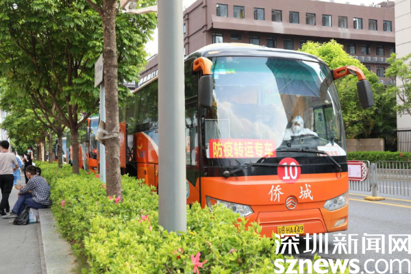 在小區外,一排防疫轉運專車停靠路邊,工作人員有序引導小區的居民登記上車。