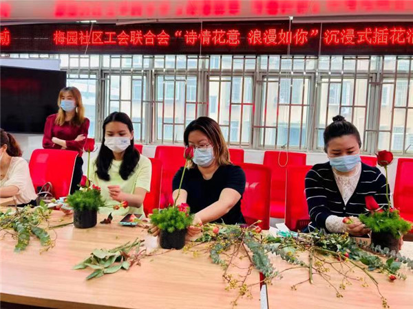 10月19日、21日,深圳市羅湖區清水河街道梅園社區工會聯合會、梅園社區婦聯、深圳市東西方社工服務社駐梅園社區黨群服務中心的社工聯合開展了兩場“詩情花意 浪漫如你”沉浸式插花活動。