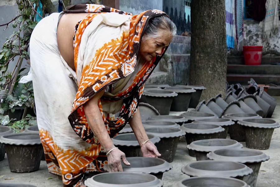 達卡遠郊區一個印度教徒聚居的村莊,幾乎家家戶戶都開辦制陶作坊,以傳統工藝制作陶盆、陶罐、陶盤和建筑裝飾陶器,遠銷孟加拉國內各地。李仁奇 攝
