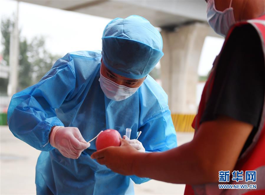 工作人員在新發地批發市場周轉新區對進場蔬果進行取樣(8月6日攝)。 新華社記者 張晨霖 攝