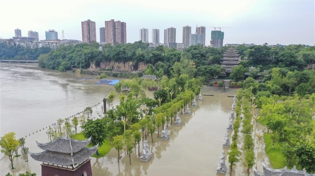 受強降雨影響,涪江潼南段迎來過境洪水。截至12日下午5時,涪江潼南城區段最高水位238.5米,超警戒水位0.5米,低于保證水位(240米)。