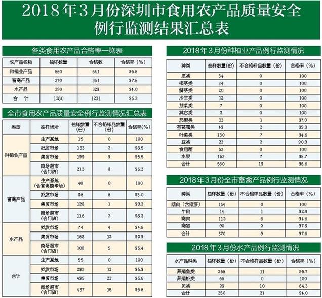 根據《市食品藥品監管局關于印發2018年深圳市食用農產品質量安全例行監測方案的通知》(深食藥〔2017〕255號),深圳市食品藥品監督管理局3月份在全市范圍內的64個食用農產品生產、經營場所抽檢食用農產品1280份,其中種植業產品560份,19份不合格;畜禽類產品370份,9份不合格;水產品350份,21份不合格。檢測不合格的產品均已實施了后續處理。詳情請登錄深圳市市場和質量監督管理委員會網站查詢,網址http://www.szaic.gov.cn/。
