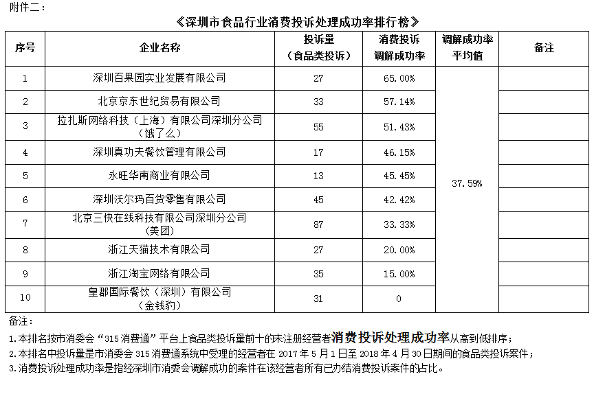 附件二:《深圳市食品行業企業消費投訴處理成功率排行榜》