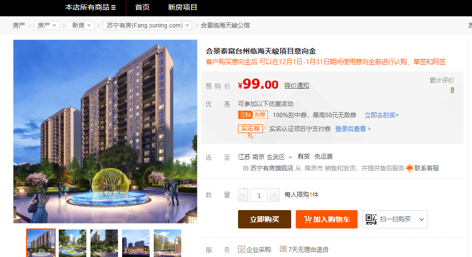 購房者在蘇寧易購首頁進入“新房特惠”專題,選擇意向房源,購買99元意向金之后,可優先購買雙十二特價房。