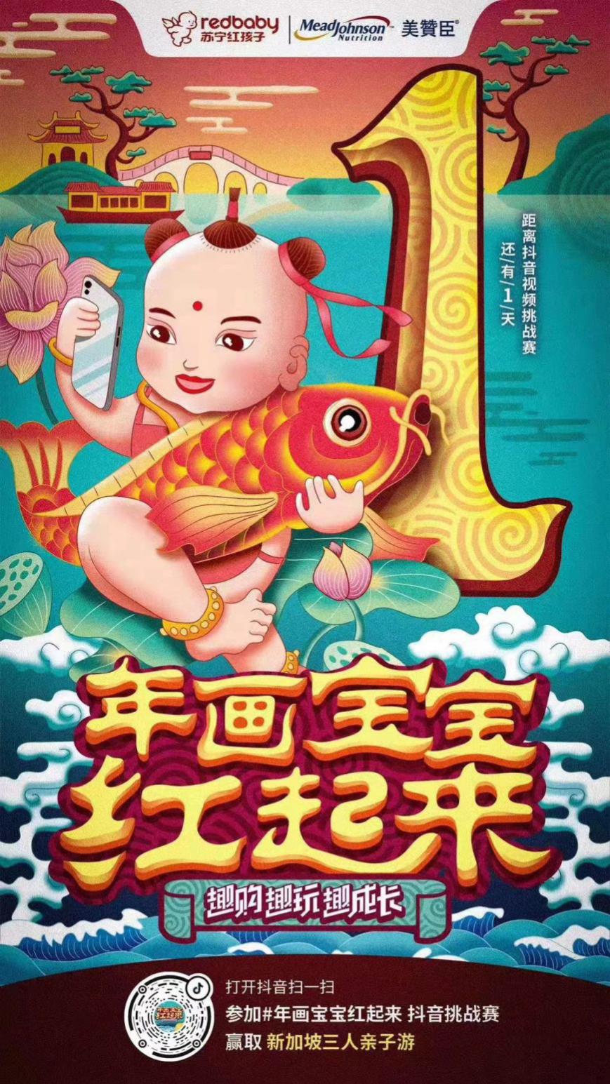 上周,蘇寧紅孩子官方發起了一場“年畫寶寶紅起來”的抖音挑戰賽活動。12月10日-12月31日,在抖音搜索話題,使用蘇寧紅孩子專屬貼紙,讓萌娃變身年畫寶寶,發布曬娃視頻,就能參與。參與活動就有機會贏取全家新加坡親子游大獎,寶萌照更有機會登上戶外大屏,紅動全城。