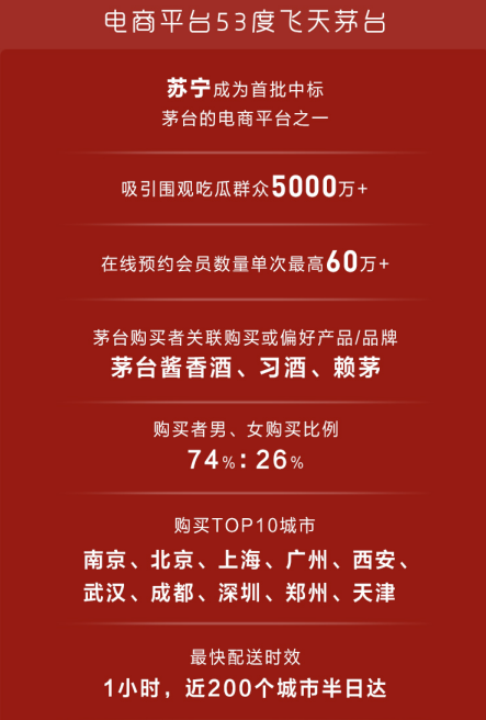 此外,蘇寧物流的半日達(dá)、次日達(dá)服務(wù),蘇寧小店的3公里最快半小時達(dá)服務(wù),也讓蘇寧酒水的配送服務(wù)優(yōu)勢明顯。