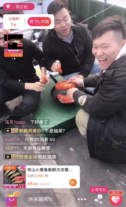 一旁直播的尹鴻狀態正好,從剛開播到現在,直播間的人數嗖嗖往上竄,不一會便聚集了十幾萬圍觀群眾。搖晃的直播鏡頭,更具真實感,似乎把觀眾帶到了船上一般。尹鴻馬不停蹄在船上踱步,給觀眾介紹各種海鮮小知識,并大力吆喝起這次直播主打的兩款產品:深海小黃魚和舟山帶魚。“我們蘇寧拼購的海產品都是從張老大這樣漁民手中收來的,下單直發,眼見為實。”