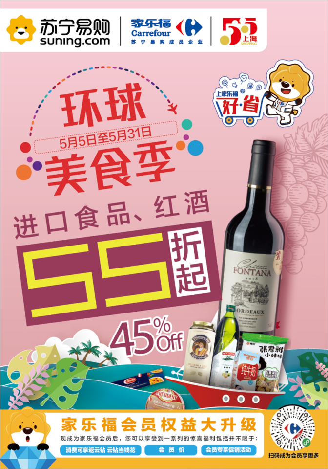 此外,家樂福方面還宣布將加大投入,全面支持上海“五五購物節,全城打折季”。5月5日至31日,上海地區家樂福門店將開啟“環球美食季”,精選來自法國、意大利、英國、西班牙、美國、加拿大、日本、韓國、馬來西亞等39個國家的350個品牌旗下共計3700多種進口食品,與上海消費者共襄盛舉。美食自然少不了美酒相伴,來自法國、意大利、西班牙、阿根廷、智利、澳洲等國家的70多個品牌旗下共計200多種進口葡萄酒,也將悉數亮相全市家樂福門店。活動期間,進口食品低至5.5折起,進口紅酒買一送一。進博會“同款”法國奧格斯汀系列葡萄酒也將首次參與促銷,葡萄酒愛好者不容錯過。