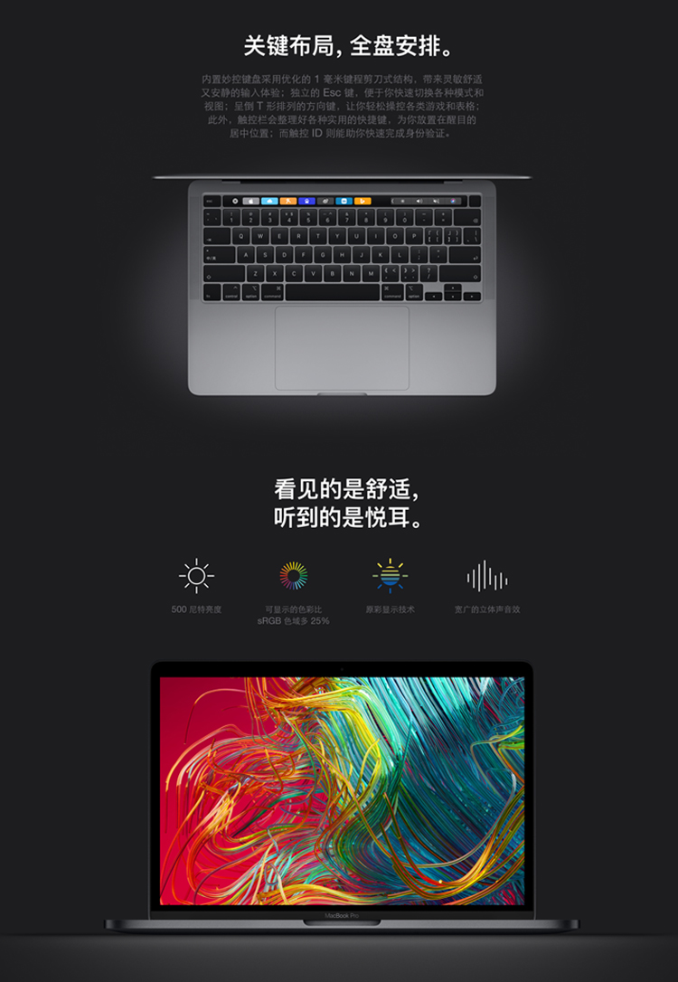 據了解,MacBook Pro配備第十代4核Intel處理器,Turbo Boost至高可達3.8GHz。絢麗多彩的視網膜顯示屏具備原彩顯示技術,視覺體驗更真實自然。還有背光妙控鍵盤、觸控ID、集成的疾速圖形處理器,以及功能豐富的觸控欄,為你帶來各種高效工作方式。