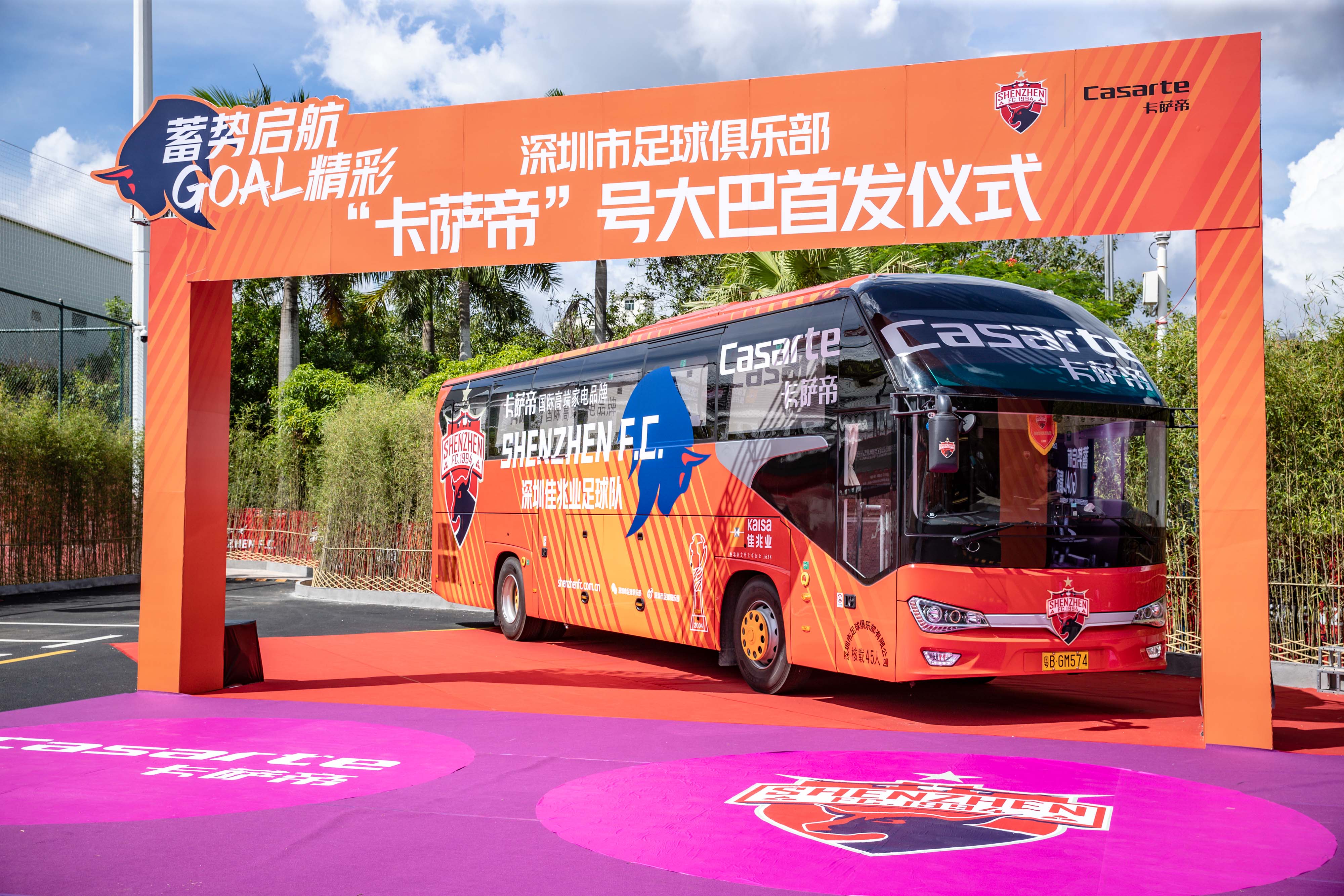 在交車儀式上,新大巴自然是當之無愧的主角。深圳佳兆業隊此次全新投入使用的大巴,外觀設計結合了深足+卡薩帝(Casarte)元素。大巴以橙色為底色,印有Casarte卡薩帝和深圳佳兆業足球隊的字樣,并在車身顯眼處印有深足LOGO。整車采用空氣動力學造型,現代感和運動感十足,是全新一代的高端公路客車產品。