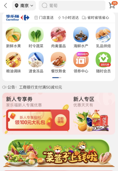 自8月8日起,消費者通過蘇寧易購 APP、家樂福微信小程序等平臺,可以一鍵購買米面糧油、乳品烘焙、水產肉類、蔬菜水果等食物,SKU超過700個。很快,菜籃子也將在蘇寧小店APP上線。門店三公里范圍內的訂單,最快25分鐘便可送到家。目前,菜籃子已經覆蓋了51座城市的215家家樂福門店。