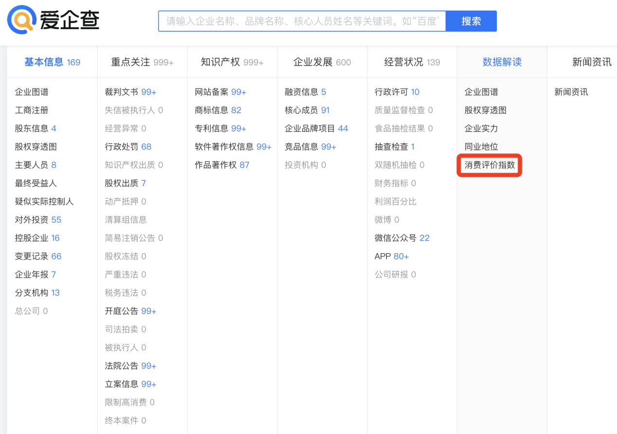 “愛企查”是百度旗下的企業信息查詢平臺,秉持著“讓每個人免費享有獲取企業真實客觀信息的權利,讓大數據服務社會,為建設信用社會發力,積極助力中小企業成長、促進經濟社會健康持續發展”的產品文化。現在,用戶通過“愛企查”電腦端和手機端官網搜索企業信息時,可通過點擊“數據解讀”菜單欄下的“消費評價指數”選項查看到深圳企業的指數情況,“愛企查”APP及百度小程序版本也將于1月底同步推出。