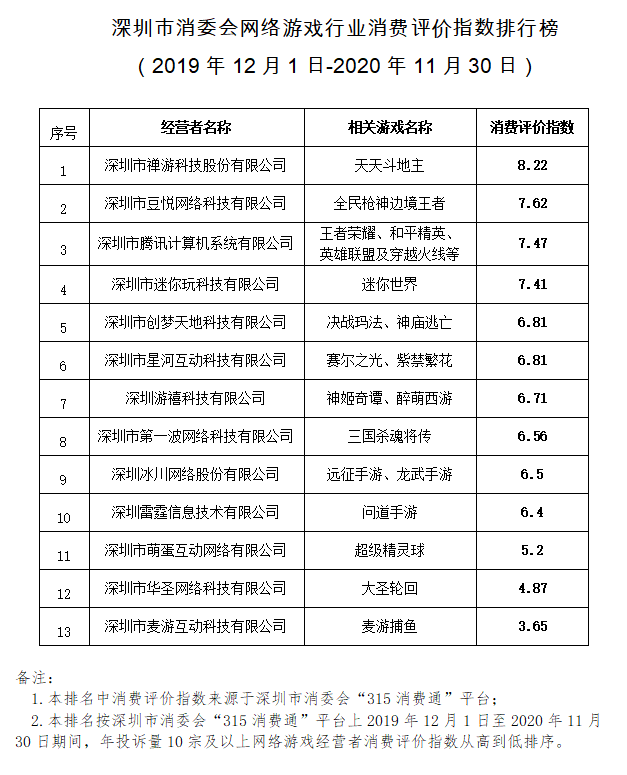 為推進網絡游戲消費者權益保護工作,促進網絡游戲行業規范發展,引導放心消費,深圳市消委會依據2019年12月1日至2020年11月30日期間的相關數據,對注冊所在地為深圳的年投訴量10宗及以上的13家網絡游戲經營者進行消費評價指數排名。