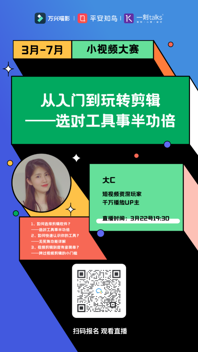 據悉,#一分鐘SHOW職場干貨#小視頻大賽自3月求職季上線,將持續至7月底,為期4個月,大賽包含作品提交至平安知鳥APP、12場線上直播、線上初賽、晉級復賽、線下決賽及頒獎典禮等環節。根據規劃,大賽設有專家評審委員會、培訓專家團,并設置數十萬獎金池,獲獎者不僅將有機會瓜分獎金大獎,更有機會成為職場知識網紅“C位”出道。萬興喵影作為活動主辦方之一,在此次大賽中將提供視頻創意軟件工具、活動專用視頻資源包、千萬播放UP主視頻制作講解直播課等資源,全方位賦能選手輸出高品質內容。