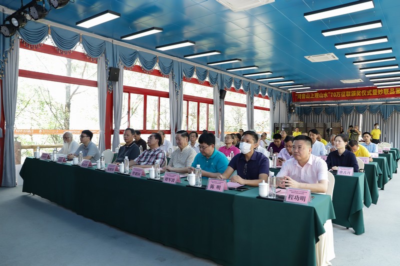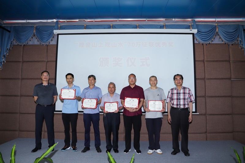 頒獎儀式現場,來自江西、河北的獲獎代表不遠千里趕來領獎,中國楹聯學會顧委副主任、中國楹聯學會原副會長、中國楹聯界最高獎項“梁章鉅獎”獲得者、本次征聯組委會主任鄒繼海,與廣東觀音山國家森林公園董事長黃淦波共同給獲得優秀獎代表頒獎。