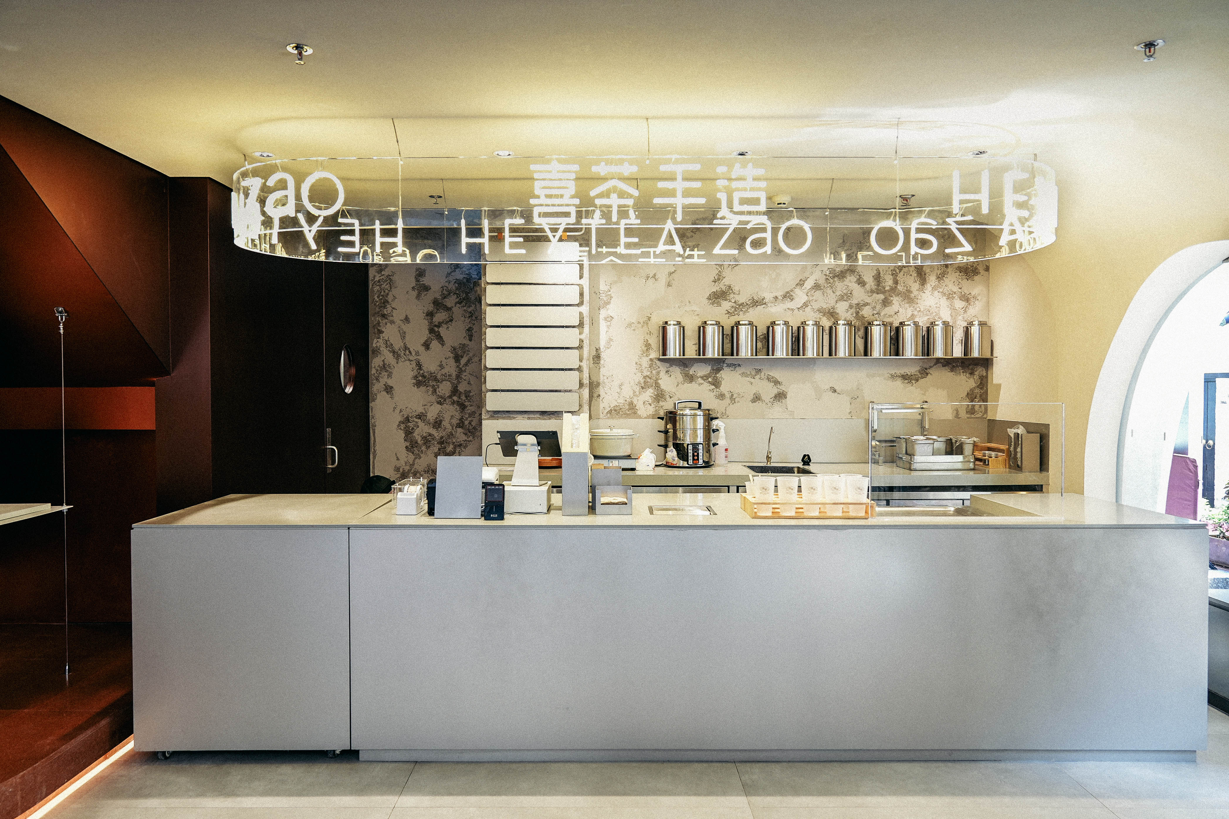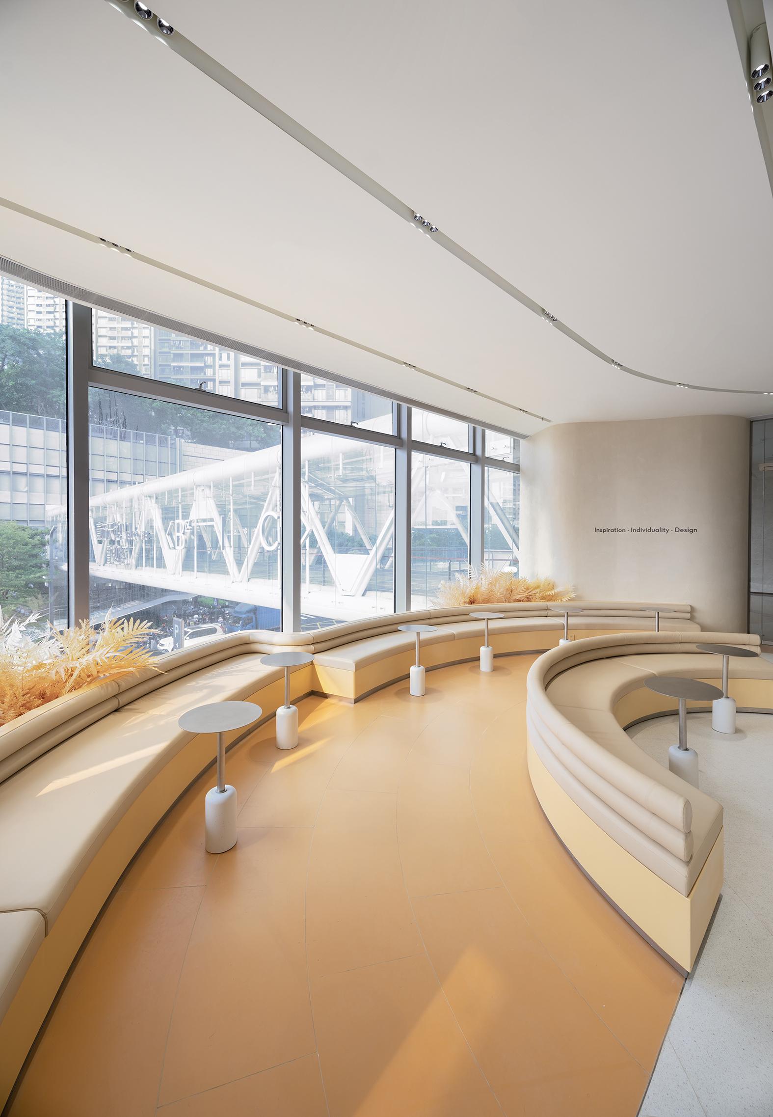 走進喜茶深圳壹方天地C區店,通透的全落地玻璃外立面,讓藍天白云似乎觸手可及;渾然一體的圓潤吧臺,讓整個空間更為純粹;橙白漸變的門店主色調,為深圳增添了一份溫柔的秋意。門店整體布局采用了圍合式布局,圍繞中心的水吧,從外立面到客區桌椅的布置都以圓弧形態進行圍合,隨性且愜意。