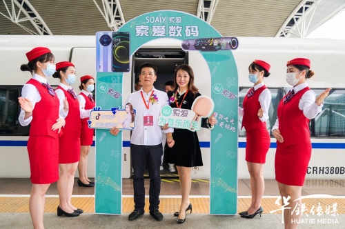 10月28日上午,索愛集團董事長劉建佳、總經理全雪梅、華鐵傳媒集團廣州分公司銷售總經理劉延群等領導嘉賓共同為冠名發車儀式揭幕、剪彩、互贈紀念禮品,在現場嘉賓的共同見證下,張貼索愛全新品牌代言人陳小春夫婦形象宣傳海報的“索愛-為音樂而生”高鐵冠名列車正式啟程。