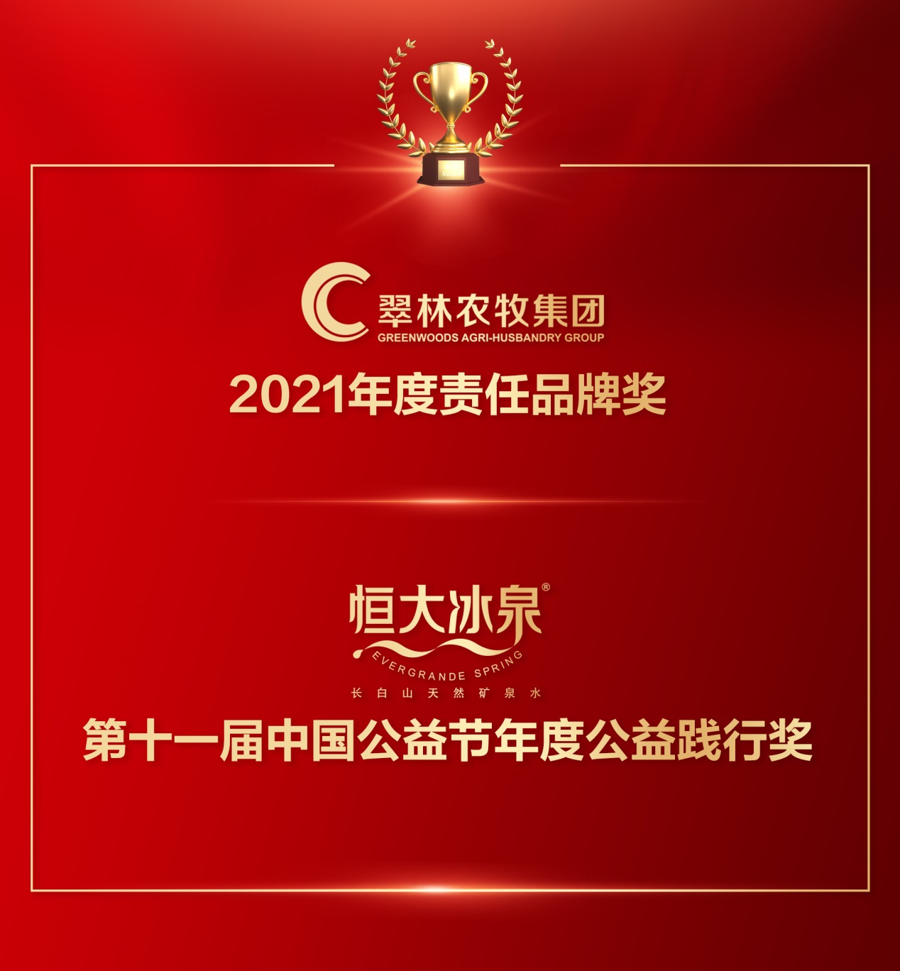 2021年,翠林農牧積極擔當企業責任,用實際行動體現了企業愛心,包括:翠林農牧旗下恒大冰泉積極響應深圳市關愛辦號召,為一線交警輔警捐贈低鈉水;在武漢解封一周年之際,向抗疫醫院捐贈恒大冰泉低鈉礦泉水1000箱;更有馳援廣佛抗疫,馳援河南水災等多項公益舉措,積極捐款捐物,踴躍開展各項捐贈活動。作為一家富有社會責任感的企業,翠林農牧集團一直致力于為全社會樹立和宣傳慈善公益領域的榜樣,時刻將社會責任概念和公益發展理念融入品牌建設中。這也正是翠林農牧集團連續獲得“2021年度責任品牌獎”和“南粵慈善公益同行活動同行機構”兩項公益類大獎,旗下恒大冰泉榮獲“第十一屆中國公益節年度公益踐行獎”的主要原因。