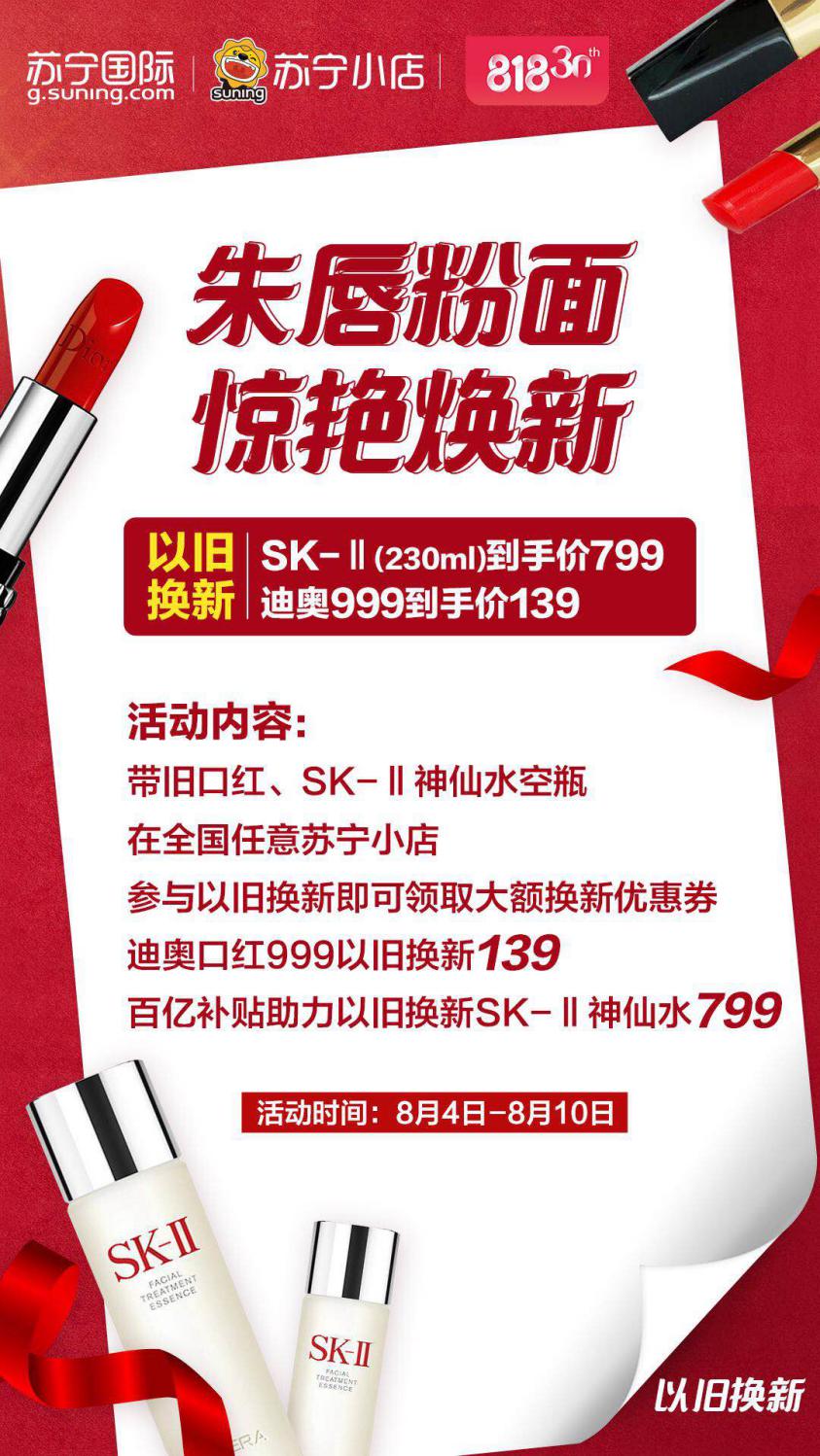 消費者可以帶家中不用的舊口紅、神仙水空瓶在全國任意蘇寧小店,參與以舊換新活動,即可領取大額優惠券,用于購買新口紅和神仙水。