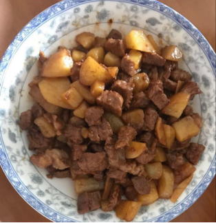 我們準備好食材:梅頭肉、土豆、生抽和老抽、姜、少量白砂糖和油。媽媽把梅頭肉在水里煮了一下。這個時候,我也沒閑著,我拿出幾個土豆,洗好,再用刨子小心翼翼地把皮削干凈。我和媽媽一起把梅頭肉和土豆切塊,把姜切細,就準備下鍋了。媽媽先倒一點油到鍋里,鍋熱后把姜放進去。接下來是切好的梅頭肉,將肉燒的泛黃后倒入土豆,然后是生抽和老抽各一小勺,還要放入少量的白砂糖,最后用水剛好沒過食材。先大火后中火再轉小火燜大約三十分鐘,收汁,出鍋!
