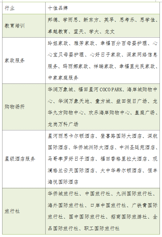 教育培訓方面20個課外培訓機構品牌的凈推薦值得分均為正值,整體平均得分為13.7,邦德教育以19.9的高分榮登教育培訓行業榜單首位;家政服務行業20家調查企業平均分值為12.8,玲姐家政以高于平均值7.4分,排名家政行業第一位;購物場所方面選取20家購物中心,20家購物中心得分同樣為正值,整體平均分為19.8,華潤萬象城以28.5的高分獲得購物中心排行榜桂冠,福田星河coco park以0.1分的劣勢排在榜單第二位;星級酒店服務方面,平均凈推薦值達到30.8分,高于同期發布其他四個行業,排名第一的是星河麗思卡爾頓酒店,凈推薦值為37.0分;旅行社方面,排名第一的旅行社為華僑城旅行社評分29.8分,但20家旅行社之間評分差異較大,凈推薦值僅為12.0分,低于同期發布的其他行業。