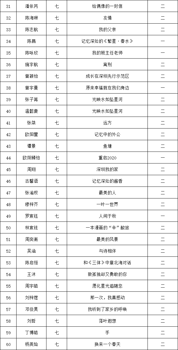 自2021年1月,活動征稿啟動以來,獲得了深圳市廣大中小學生、教師、文學愛好者的熱烈響應積極參與,吸引了深圳百余所學校的上萬人關注報名。現公布龍華區外國語學校專場晉級復賽名單如下: