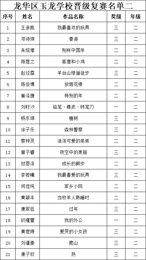 自2021年1月,活動征稿啟動以來,獲得了深圳市廣大中小學生、教師、文學愛好者的熱烈響應積極參與,吸引了深圳百余所學校的上萬人關注報名。現公布龍華區玉龍學校專場第二批晉級復賽名單如下: