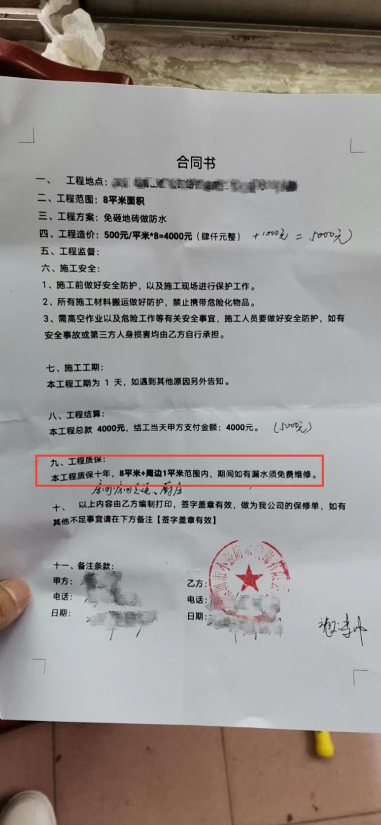 本人于2022年3月29日與該商家簽訂施工合同,支付4000元做防水工程并于當天施工,到了雨季發現施工處依然漏水,聯系商家上門維修了1次,但之后發現施工處仍然漏水,多次聯系商家無回復。合同中約定工程質保10年,現要求商家按照合同約定免費提供維修服務。
