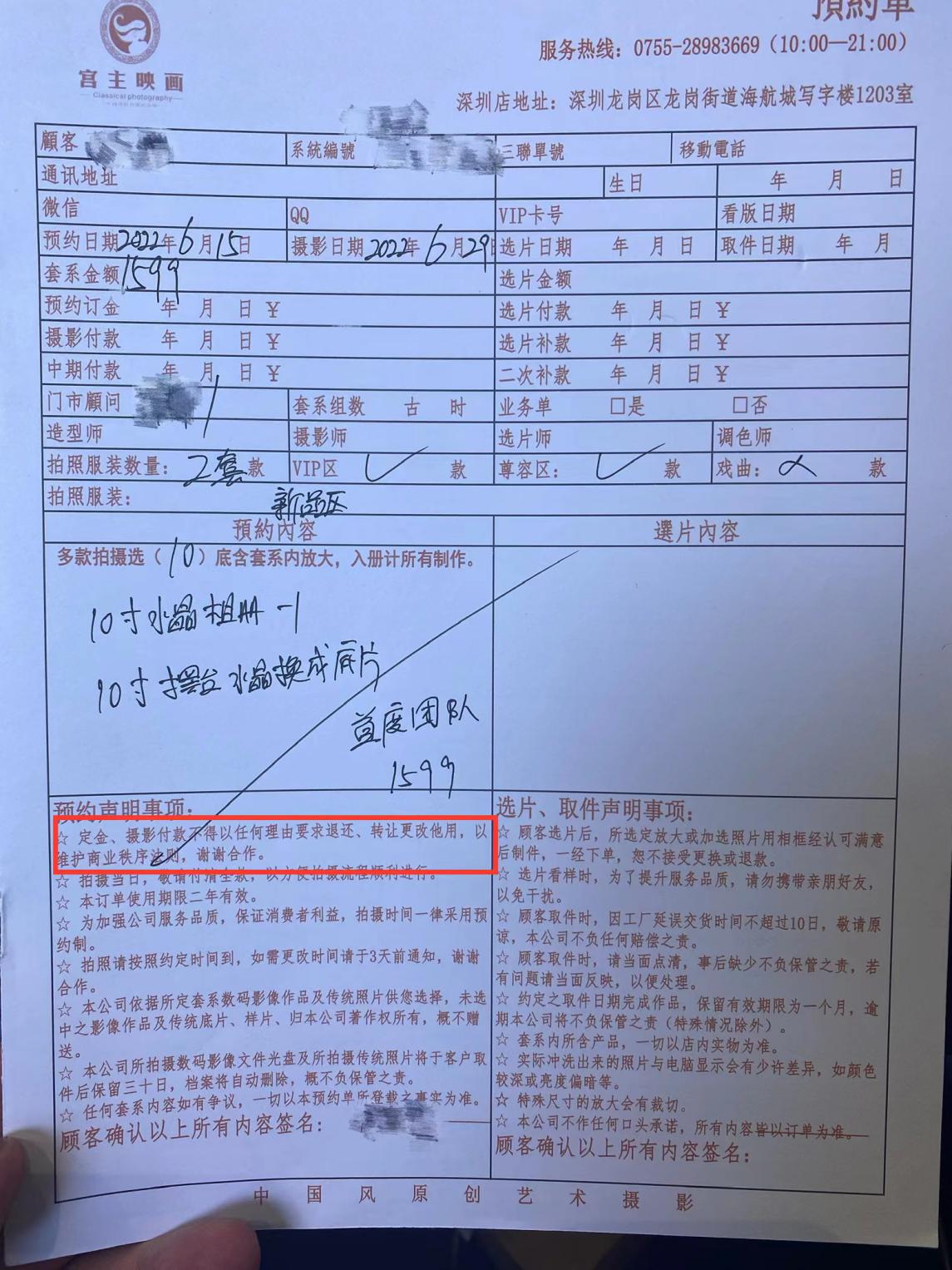 本人于2022年6月15日在該商家處支付了1599元購買寫真拍攝服務,購買后因故離開深圳,無法繼續消費,故要求退還預付款。